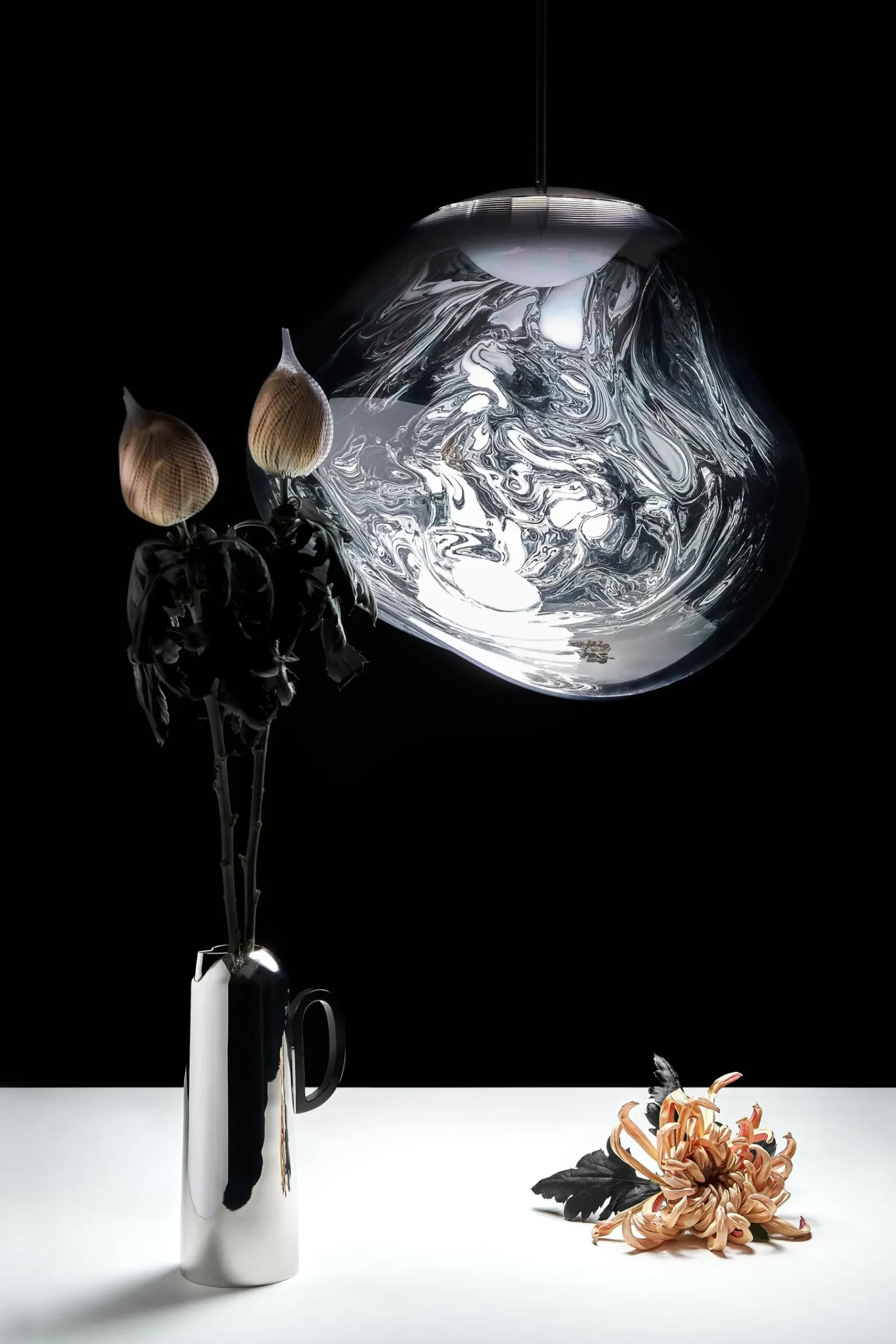 Melt pendant is a beautifully distorted pendant with a matching ceiling rose. Featuring an integrated LED module, it creates a mesmerizing hot-blown glass effect when on and a mirror-finish effect when off. Made in Germany using high-tech manufacturing, it evokes molten glass or the interior of a melting glacier.