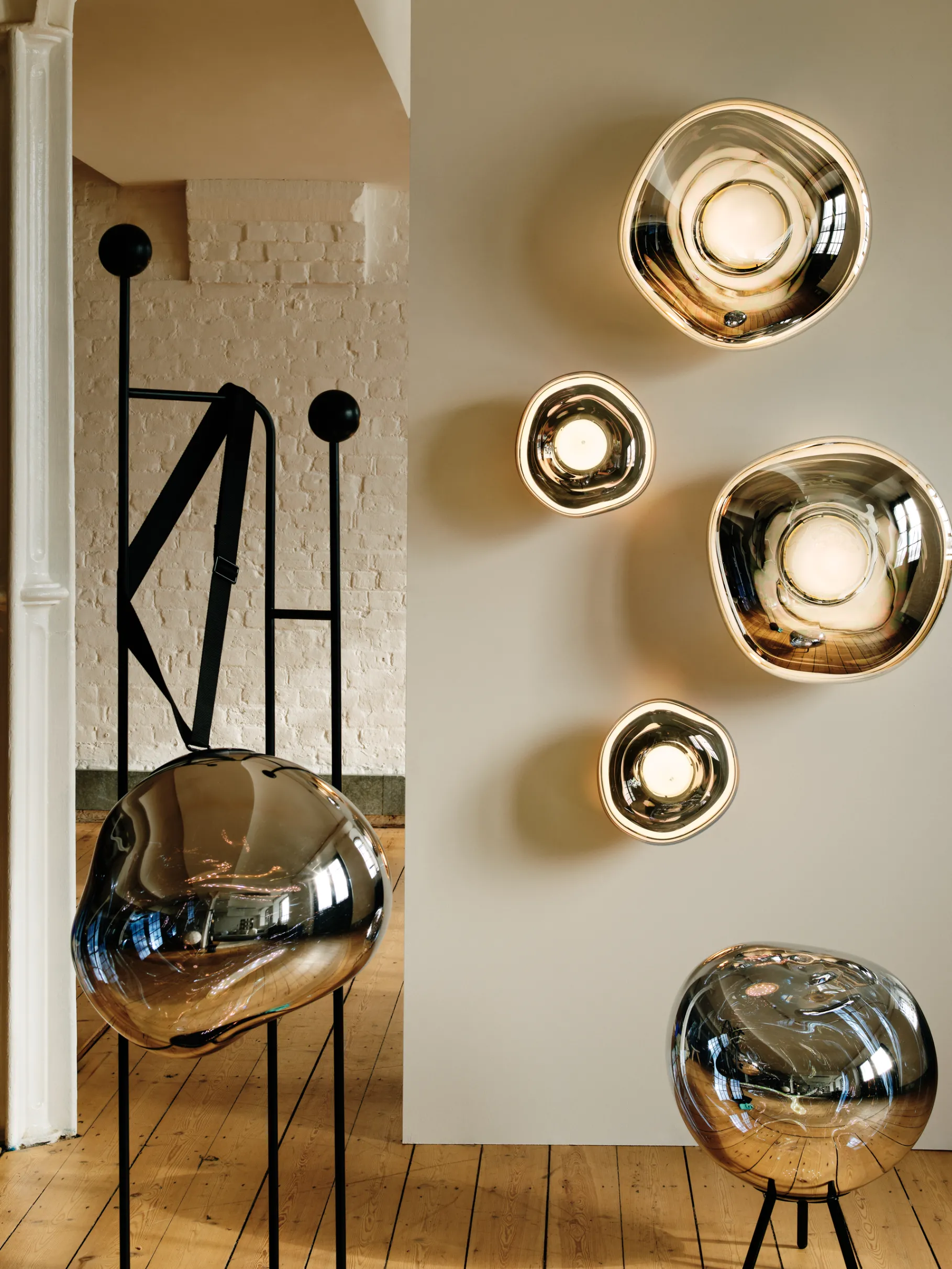 The Melt mini surface light is a beautifully distorted small surface light in a modern Chrome finish. Featuring an integrated LED module, it creates a mesmerizing hot-blown glass effect when on and a mirror-finish effect when off. Made in Germany using high-tech manufacturing, it evokes molten glass or the interior of a melting glacier.