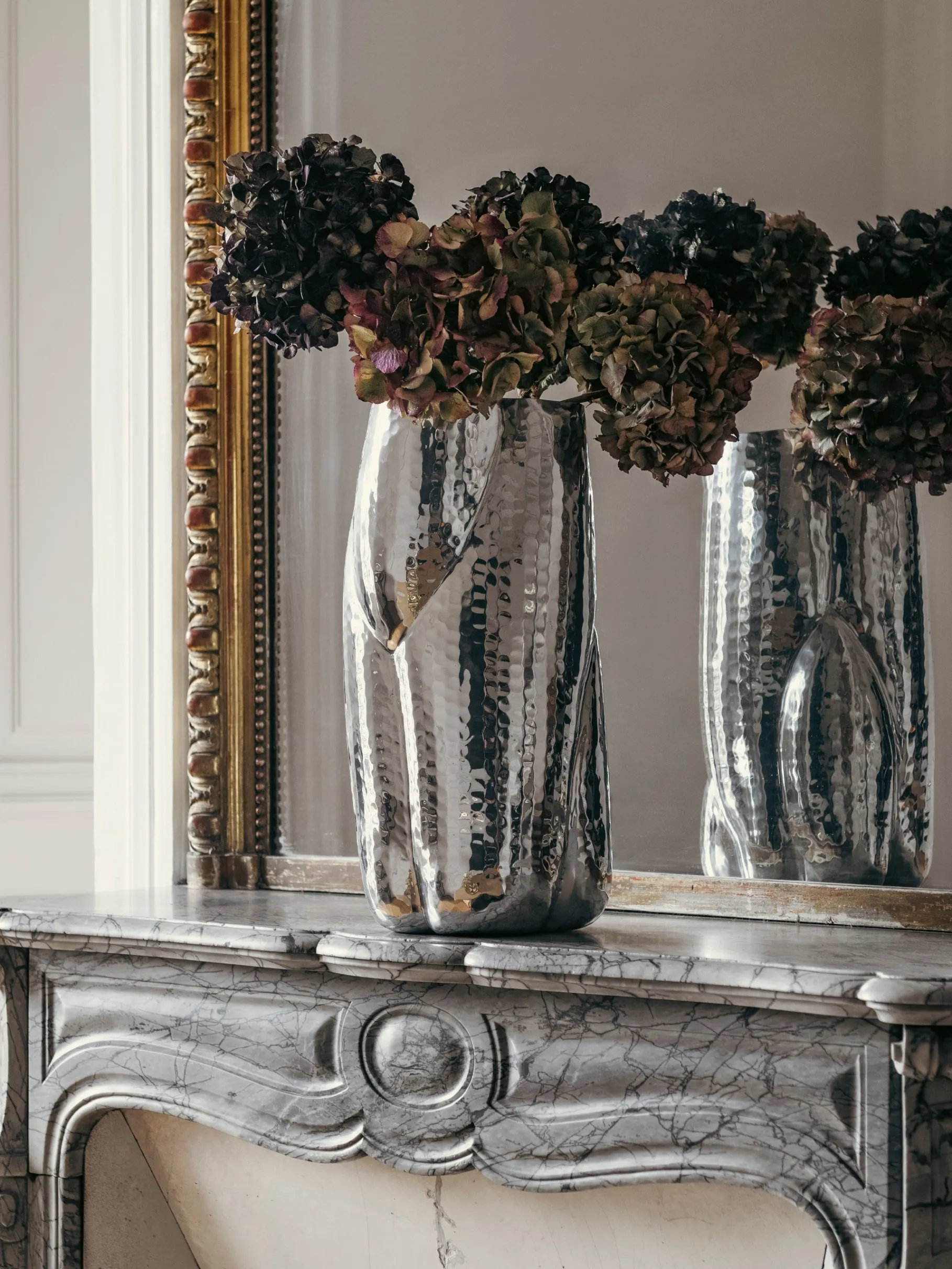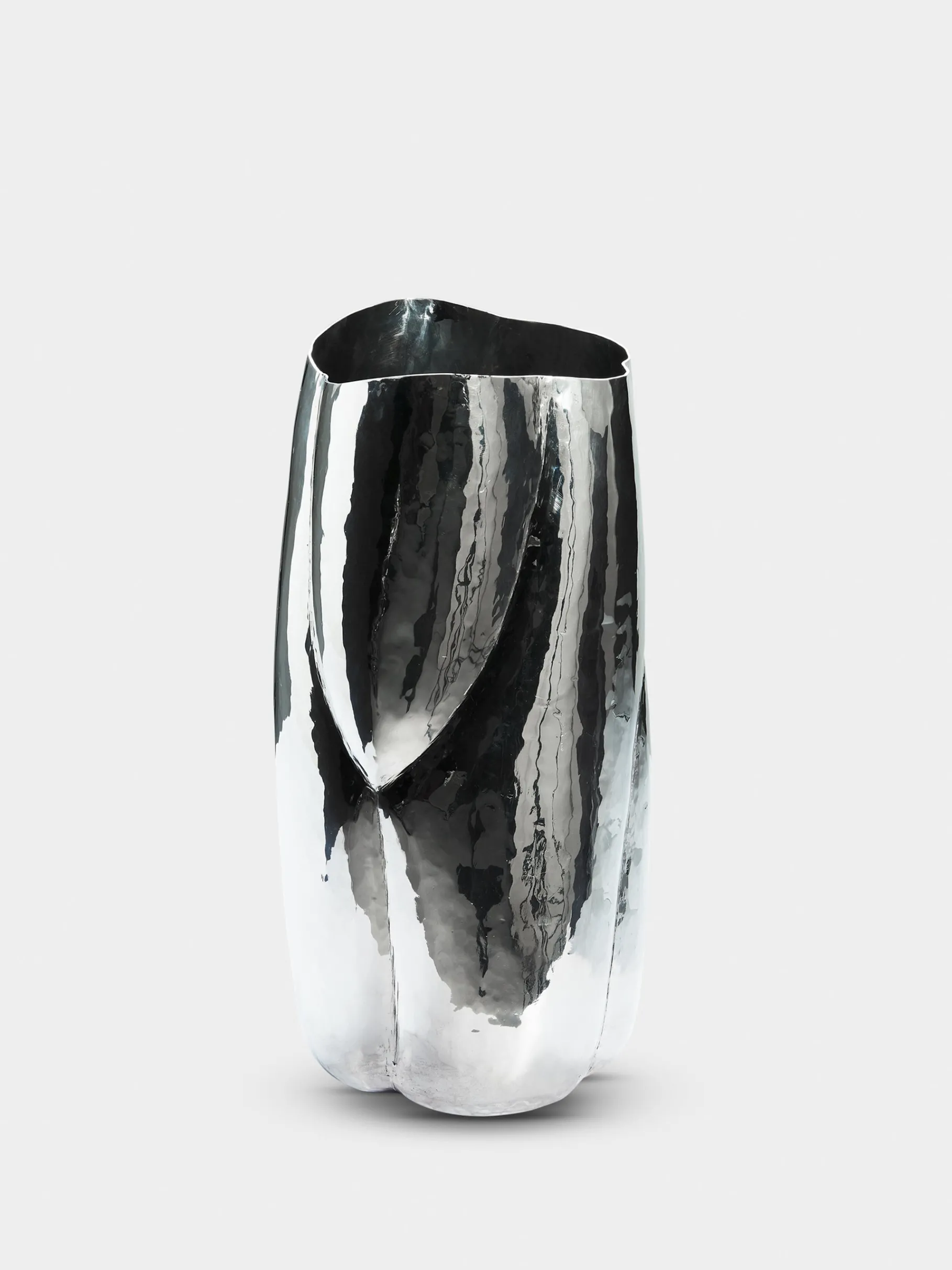 Cloud is a family of sculptural pieces made of highly reflective polished aluminium. The collection includes a platter, bowl, short and tall vessel, all of which are handmade by skilled artisans in India. Each Cloud vessel is impactful, and water-tight so can be used for floral arrangements, and also dry-food safe.