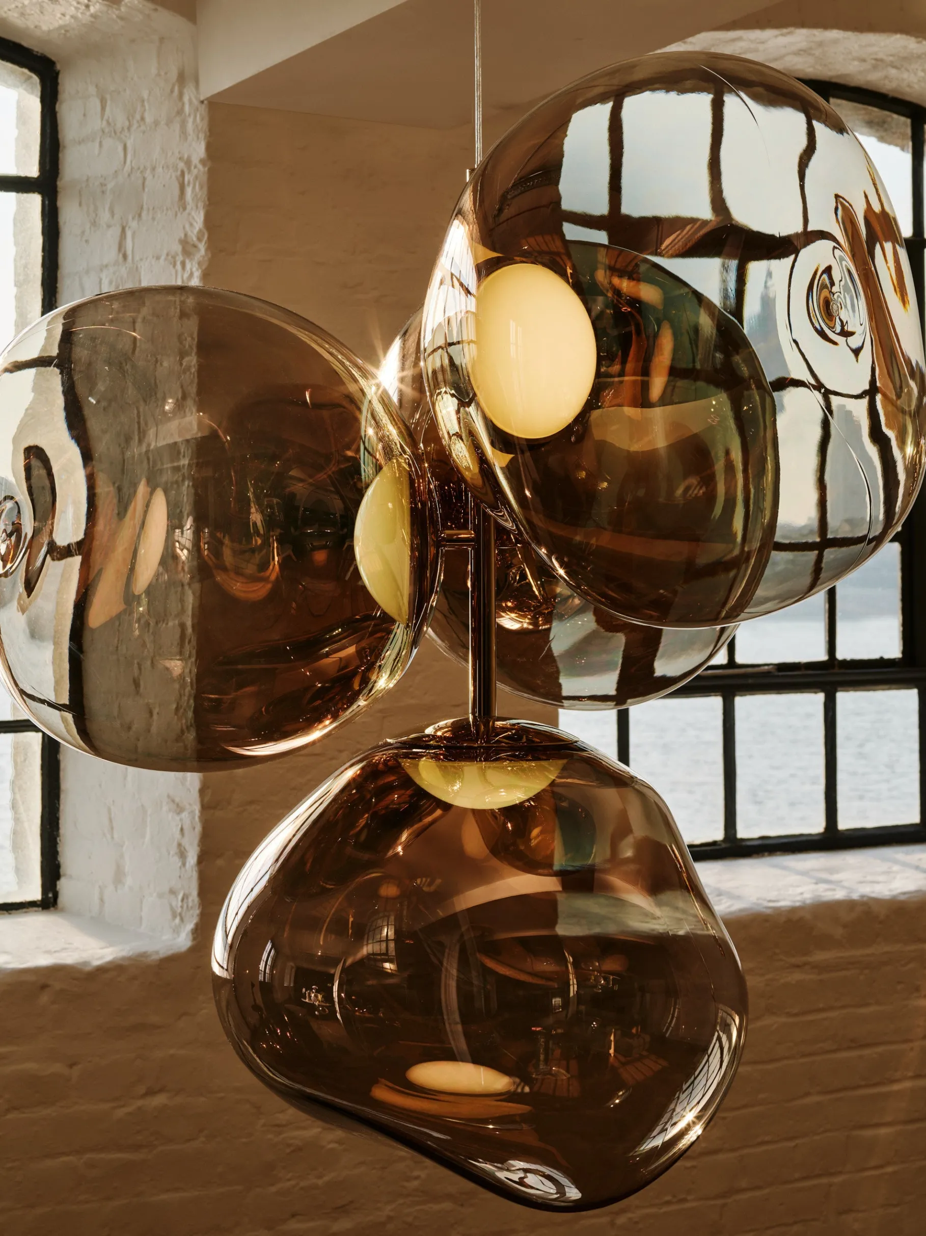 Evocative of molten glass, the MELT Mini Chandelier in bronze produces a mesmerising hot-blown glass effect. MELT is created through a process of blow moulding and vacuum metallisation to achieve melted orbs with abundant and unusual luminosity. Suitable for either residential or commercial spaces, e