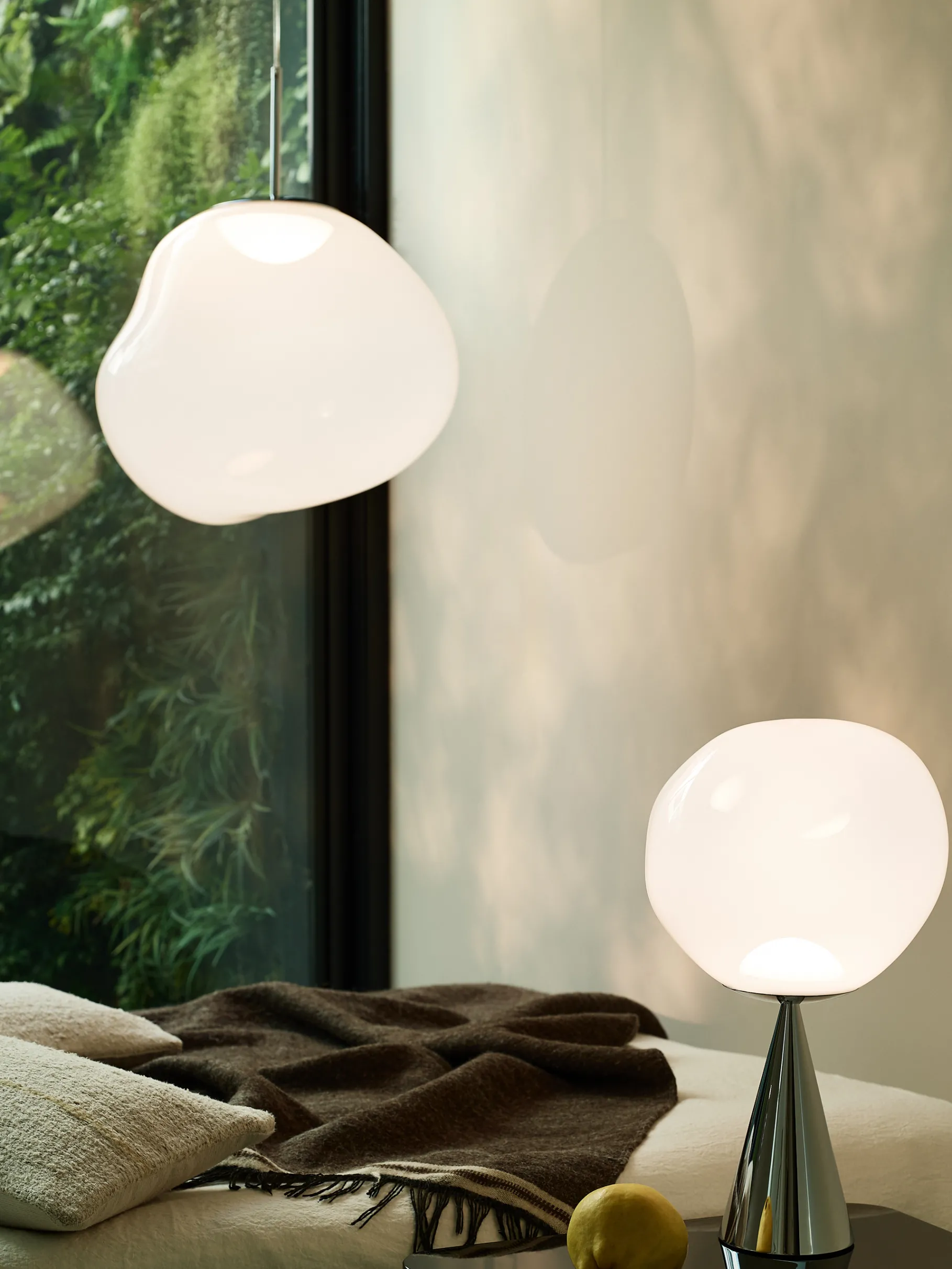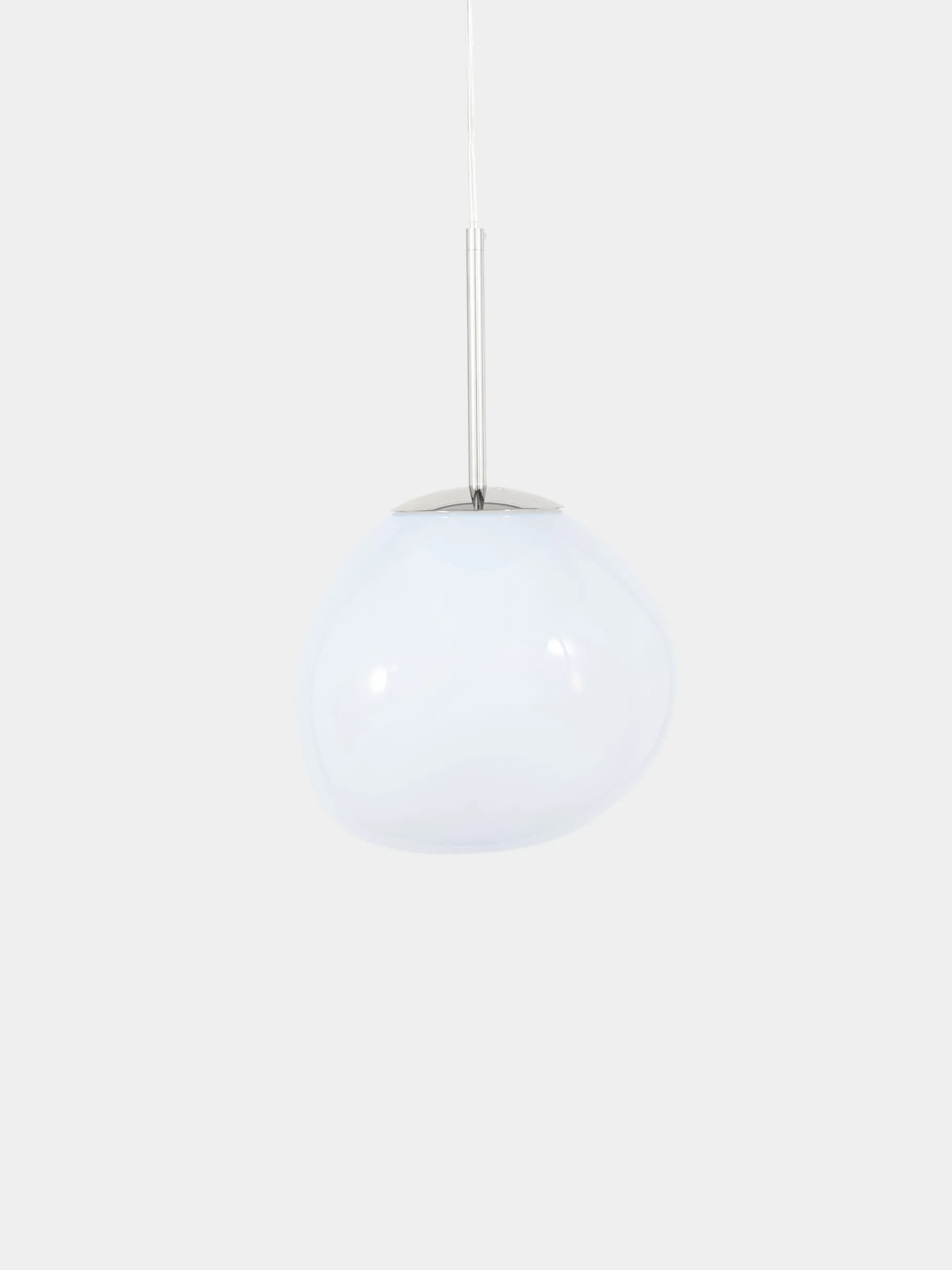 The Melt mini pendant in opal has a modern chrome finish and matching ceiling rose. With an integrated LED module, it creates a mesmerizing hot-blown glass effect when on and a mirror-finish effect when off. Made in Germany using high-tech manufacturing, it evokes molten glass, and is perfect for smaller spaces.