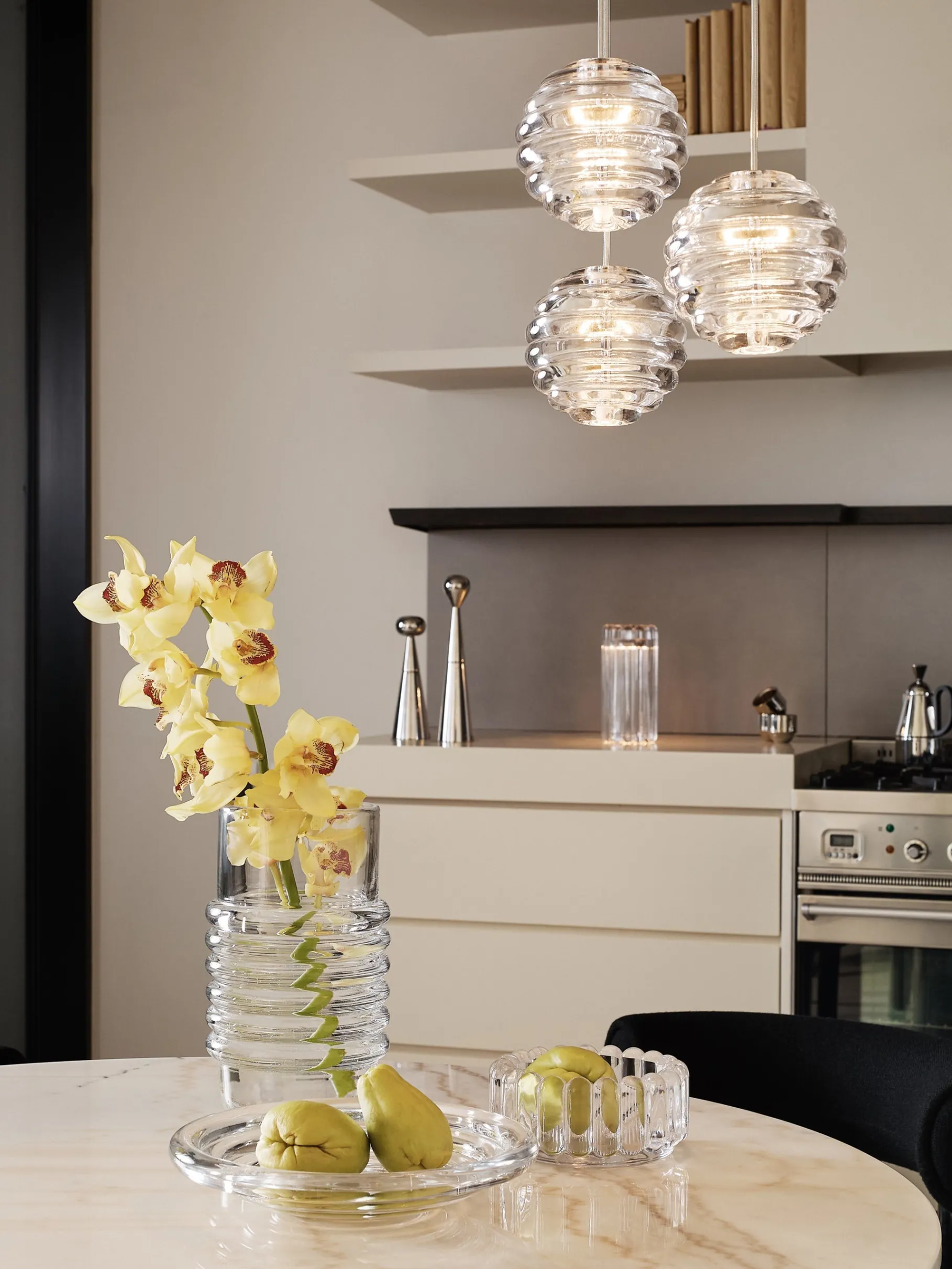 The Press Mini Sphere Pendant Light is designed to catch and refract light and cast eye-catching shadows. The heavyweight grooved light is made of chunky coils of pure glass. Created to be hung in multiples, or equally striking on it’s own, it comes with a warm 2700k LED ring as standard.