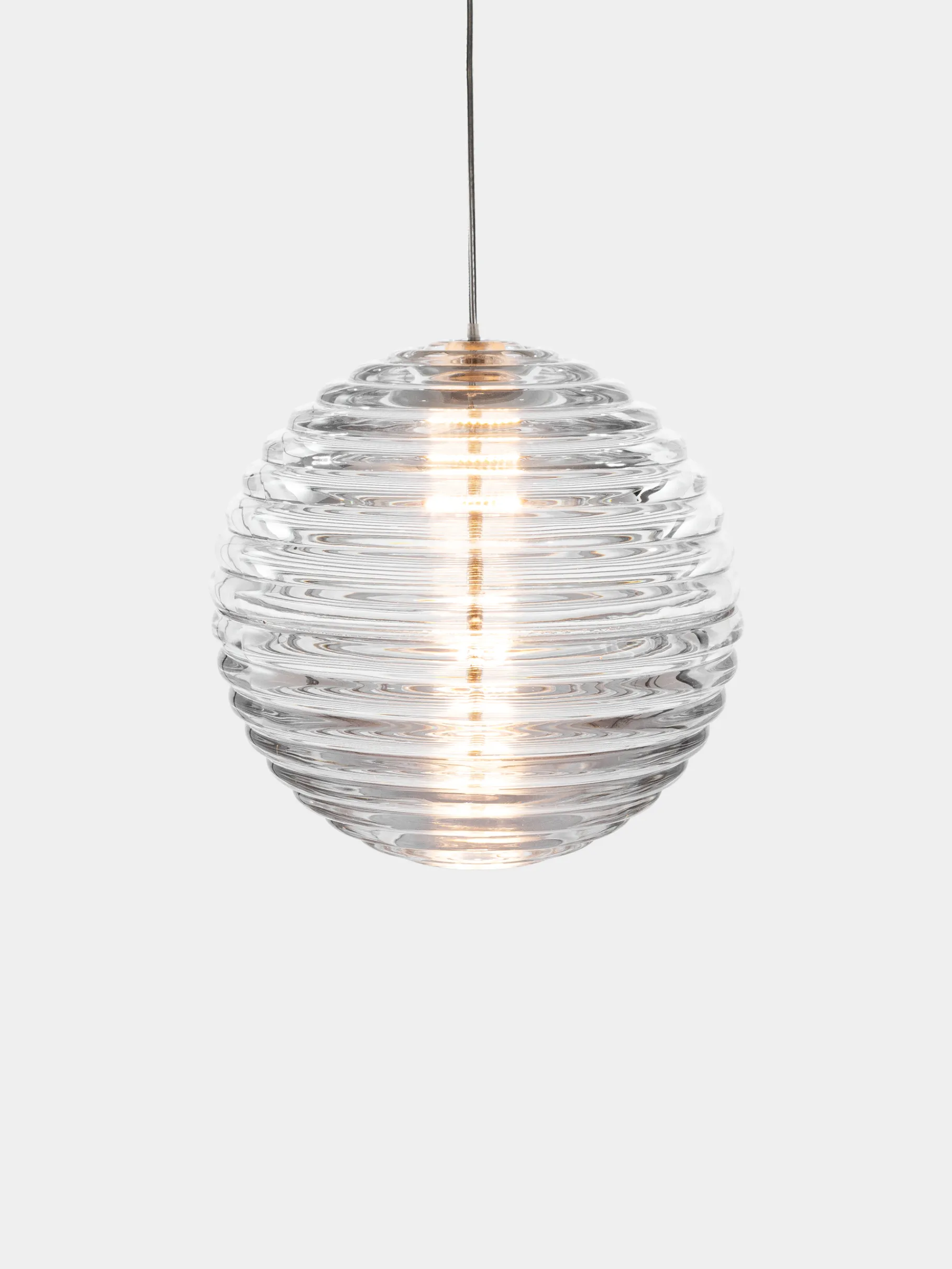 The Press Sphere Pendant Light is designed to catch and refract light and cast eye-catching shadows. The heavyweight grooved light is made of chunky coils of pure glass. Created to be hung in multiples, or equally striking on it’s own, it comes with a warm 2700k LED ring as standard.
