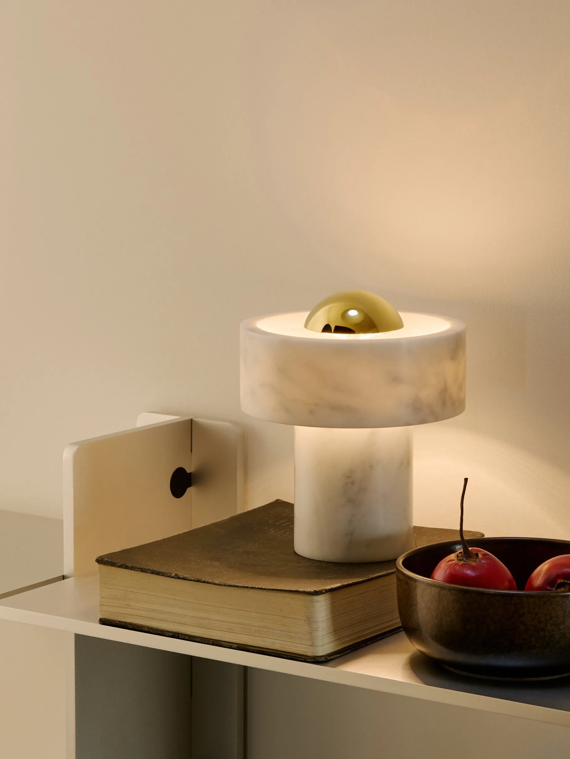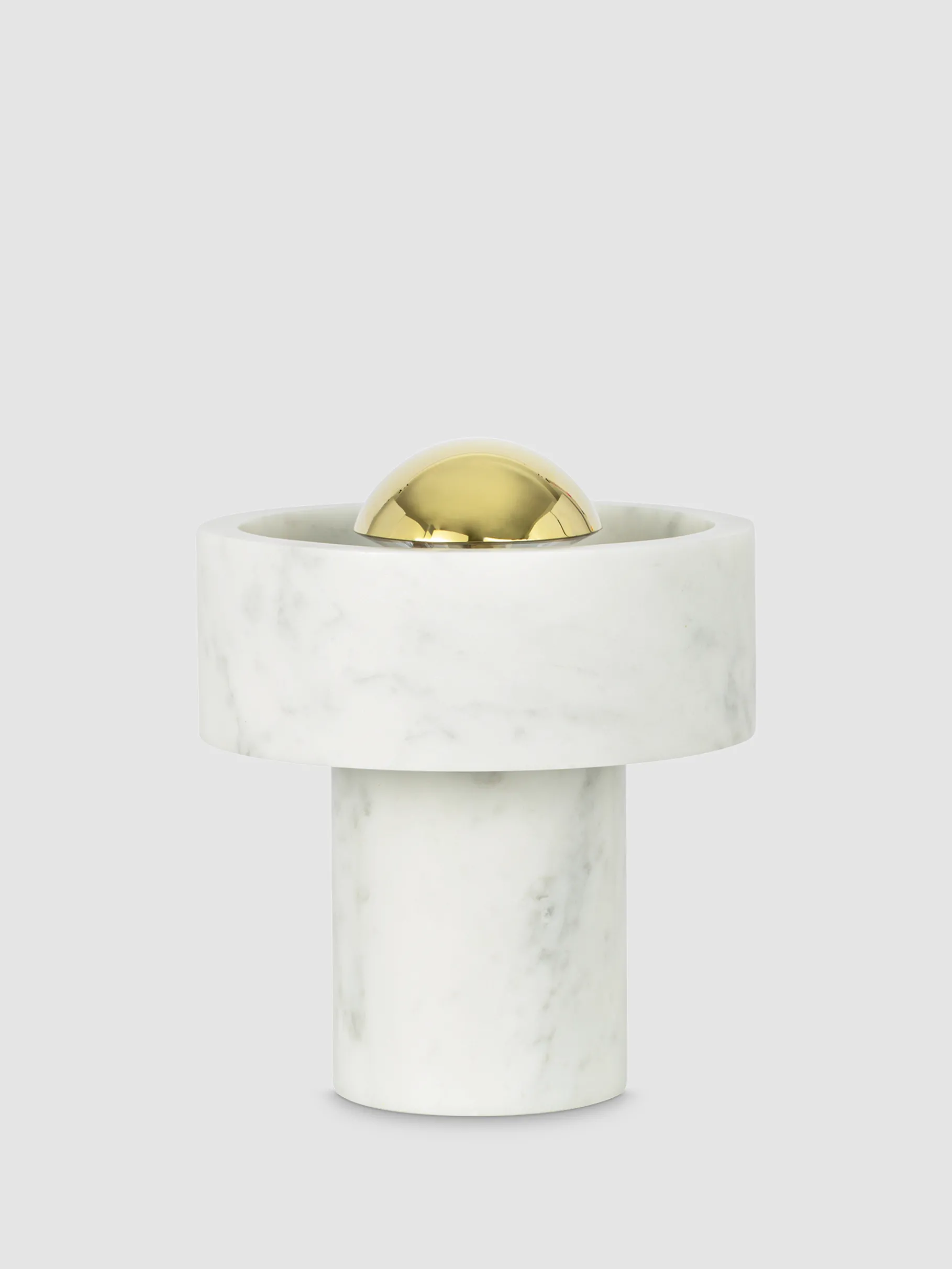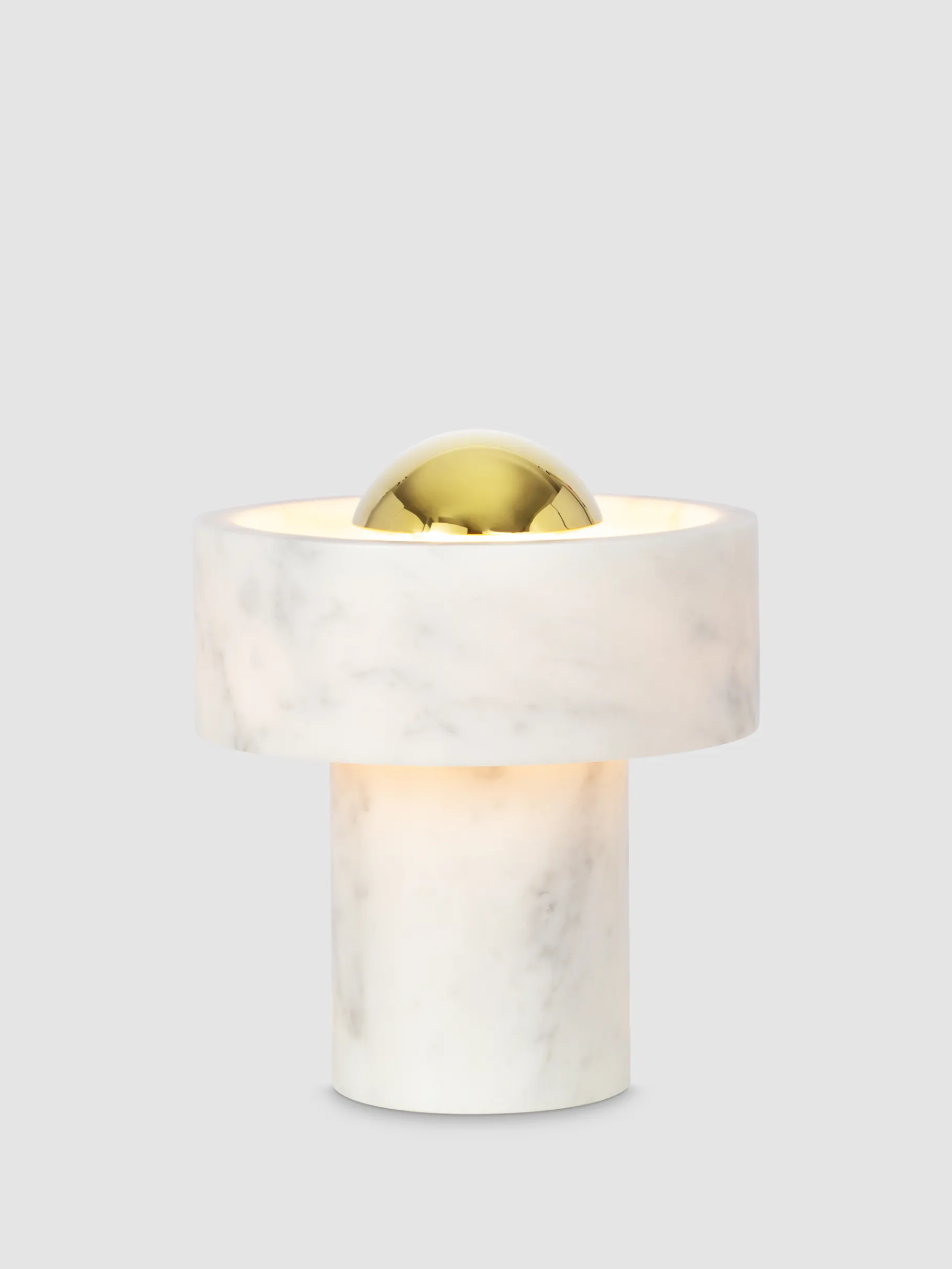 The stone portable LED is crafted from heavy white marble, offering a tough yet tactile feel. This portable light features solid marble and gold with an integrated touch dimmer. The stone is characterized by a solid outer marble ring that appears to float around the light source, emitting a soft halo effect.